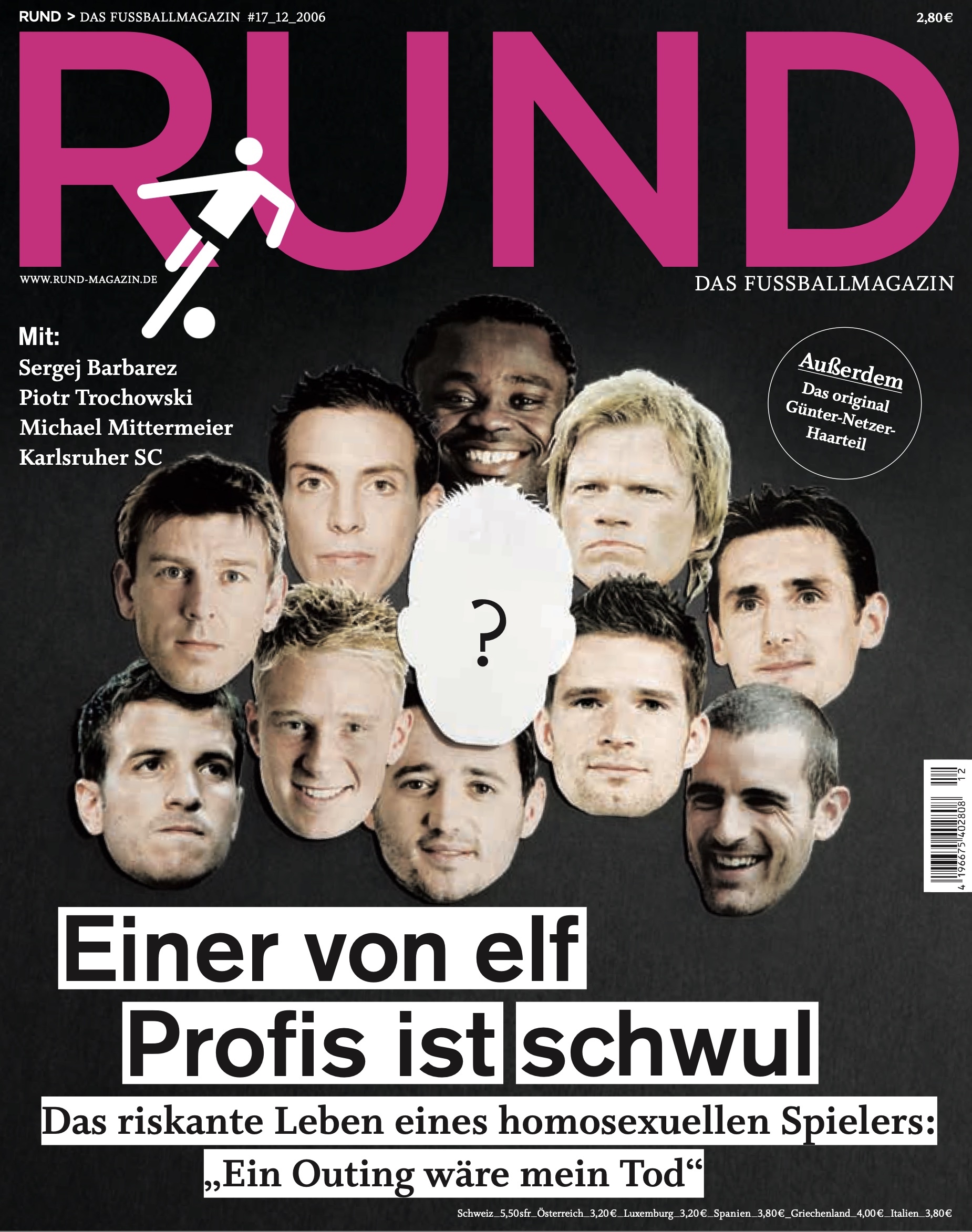 Schwule Fußballprofis gibt es nicht, so eine weit verbreitete Meinung. Dabei müsste – statistisch betrachtet – einer von elf Bundesligaspielern homosexuell sein. Dem RUND-Magazin sind drei schwule Profis bekannt, doch Namen können und sollen in dieser Geschichte nicht genannt werden – das Klima im Fußball ist immer noch derart schwulenfeindlich, dass die Folgen für die Spieler nicht abzusehen wären. Die Titelgeschichte aus dem Dezember 2006 von Oliver Lück und Rainer Schäfer